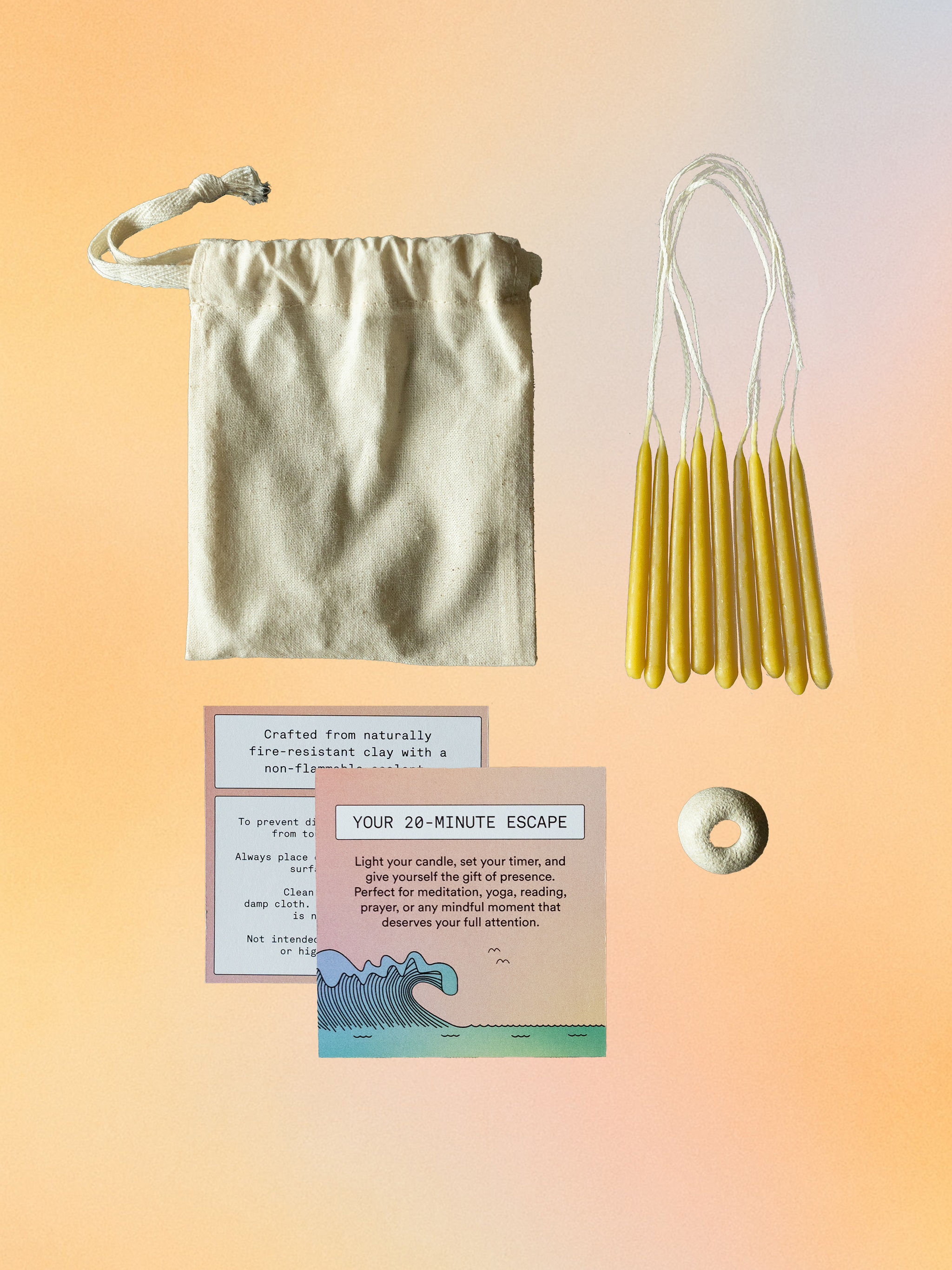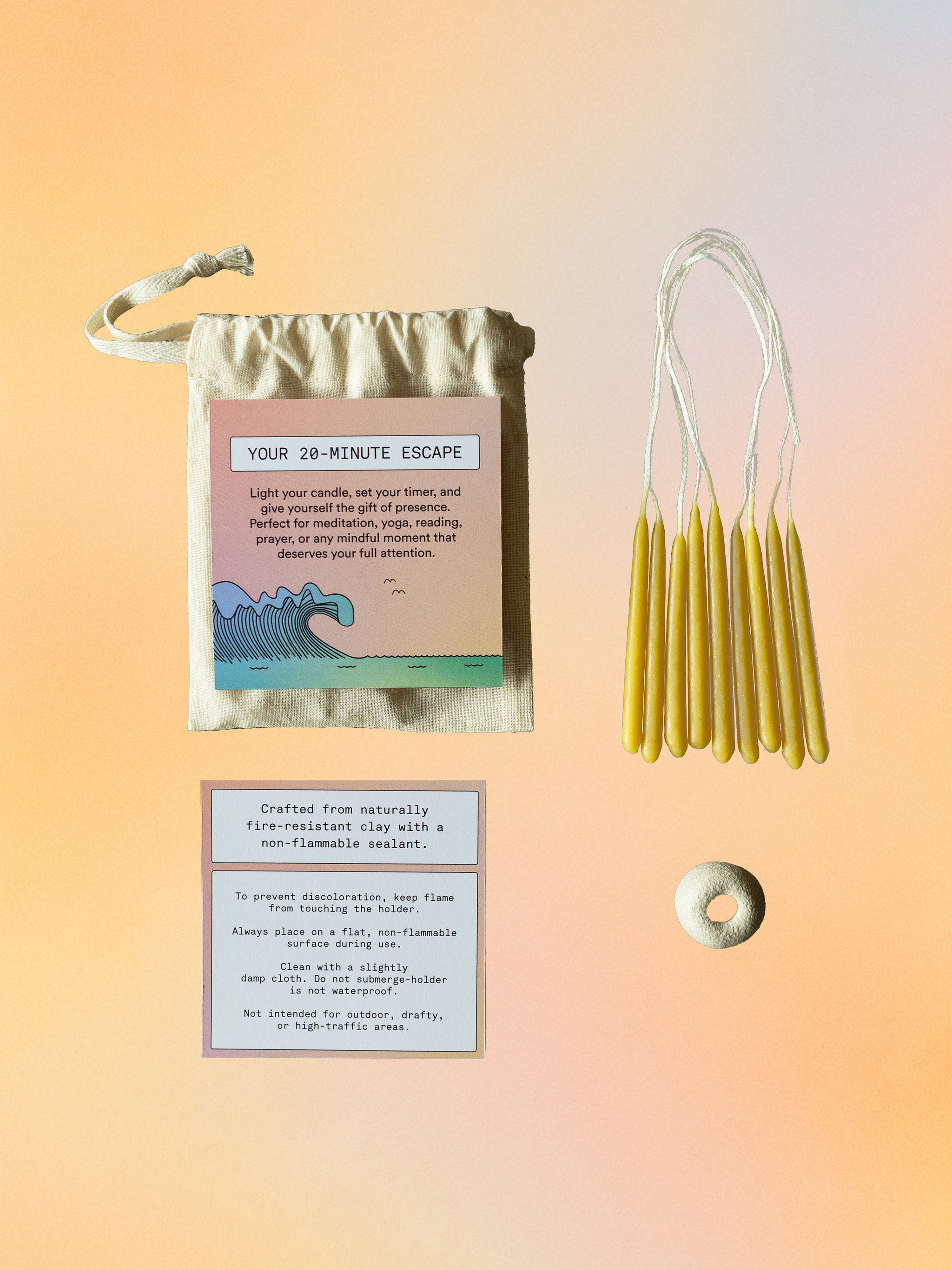 Twenty minutes is meaningful. That’s the burn time of each honey-scented beeswax candle; long enough to mark a journal session, a meditation, or a meal without your phone. Each holder is hand-shaped, hand-painted, and hand-stamped with our Magic Mind bird logo by a small-batch female artist based in the United Kingdom.